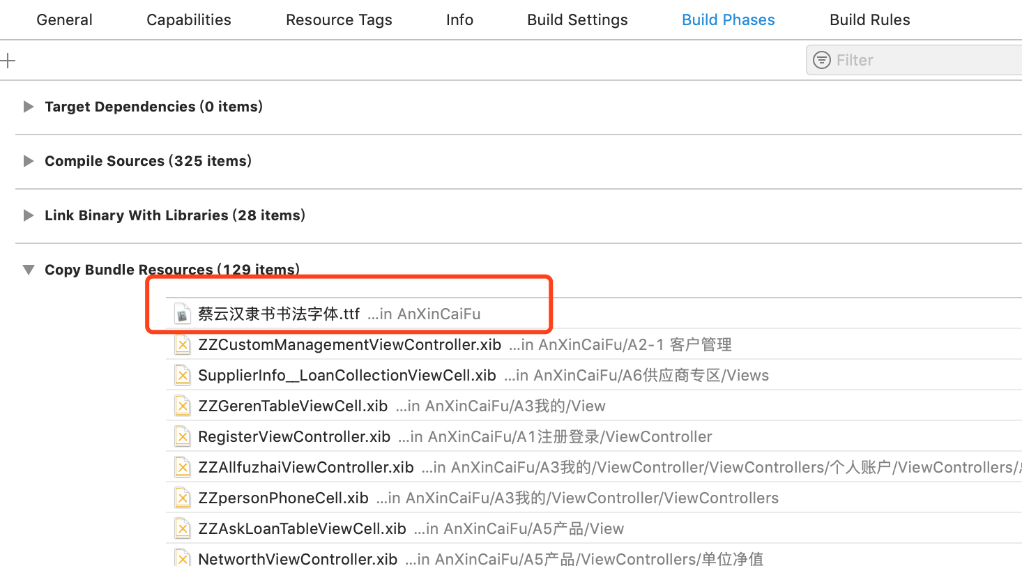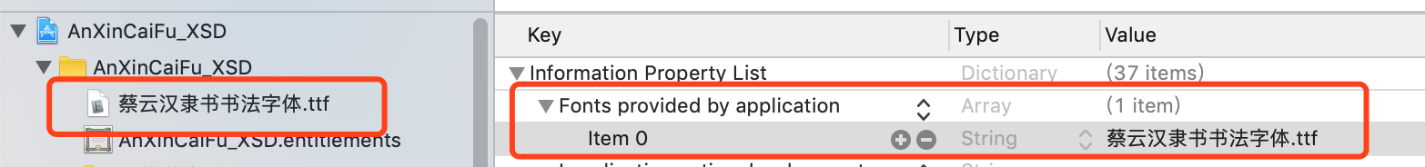 在info.plist文件中添加Fonts provided by application,item写上文件名,我这里是蔡云汉隶书书法字体.ttf。这时候需要检查一下Build Phases –> Copy Bundle Resources里面有没有我们拖进去的文件。如果没有,把它Add进去。
