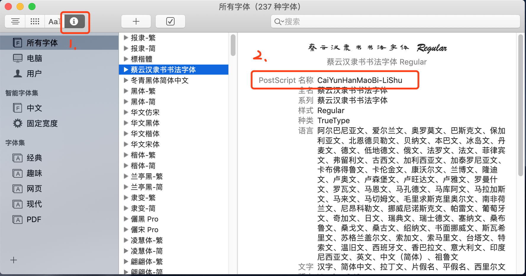 但是,我们现在还不能使用,因为我们需要找到这个字体的PostScript名称 那到底要怎么找呢?我们先在电脑上安装这个字体,这时候会在字体册看到它,然后如图操作就可以了。
